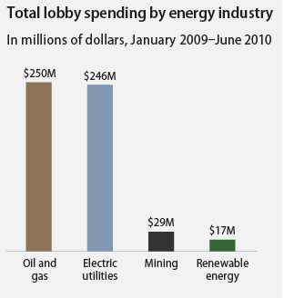 The study “Dirty Money” found that the top 35 spending companies and trade associations invested more than $500 million in lobbying and campaign contributions from January 2009 to June 2010 to defeat clean energy legislation. This political pressure spending convinced enough senators to oppose clean energy measures that would have created jobs, reduced oil use, and cut global warming pollution.”